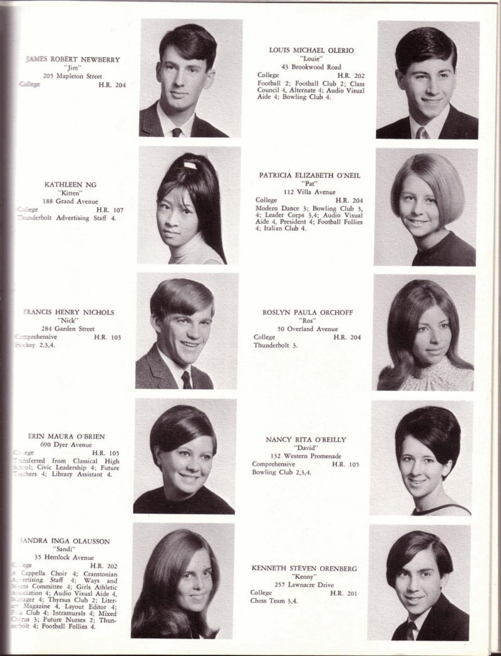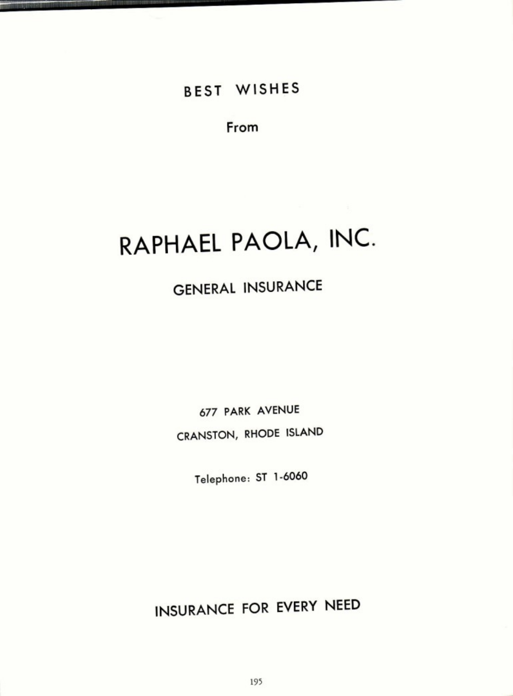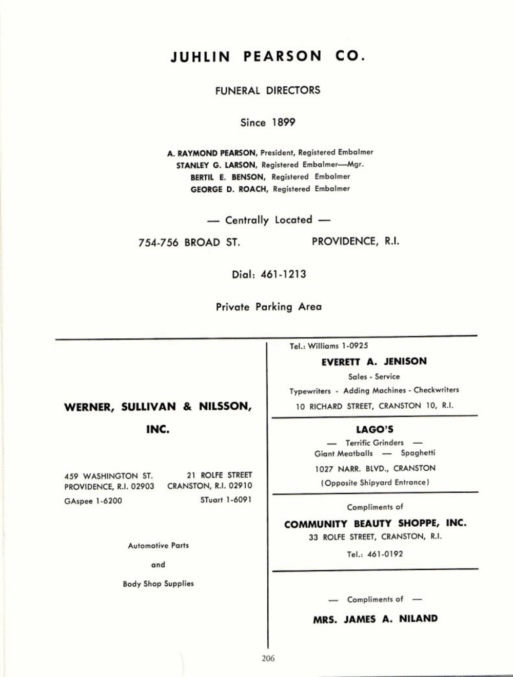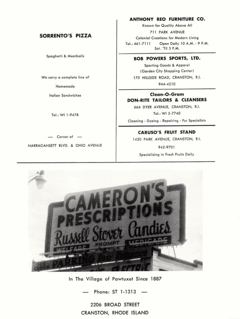 Ads - H.I.M. Mills, John L & Arlene S, Pawtuxet Liquor Store, Frank Branch Texaco, E Michaels Agency, F.W. Woolworths, Cortland Decorators |
